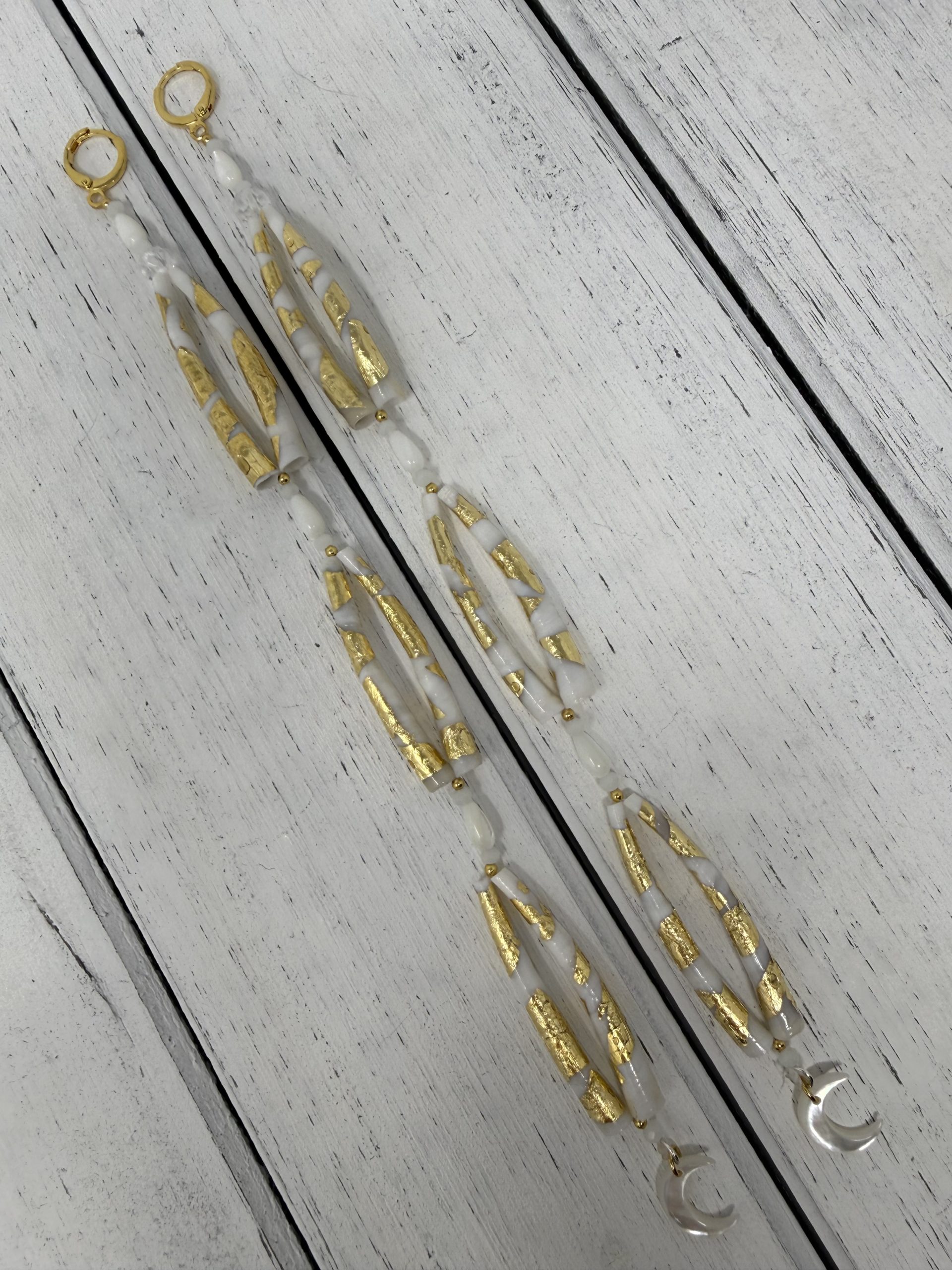Double Sealed Gold Leaf. 18K Gold latch hooks & findings. Freshwater shells with crystal beads.