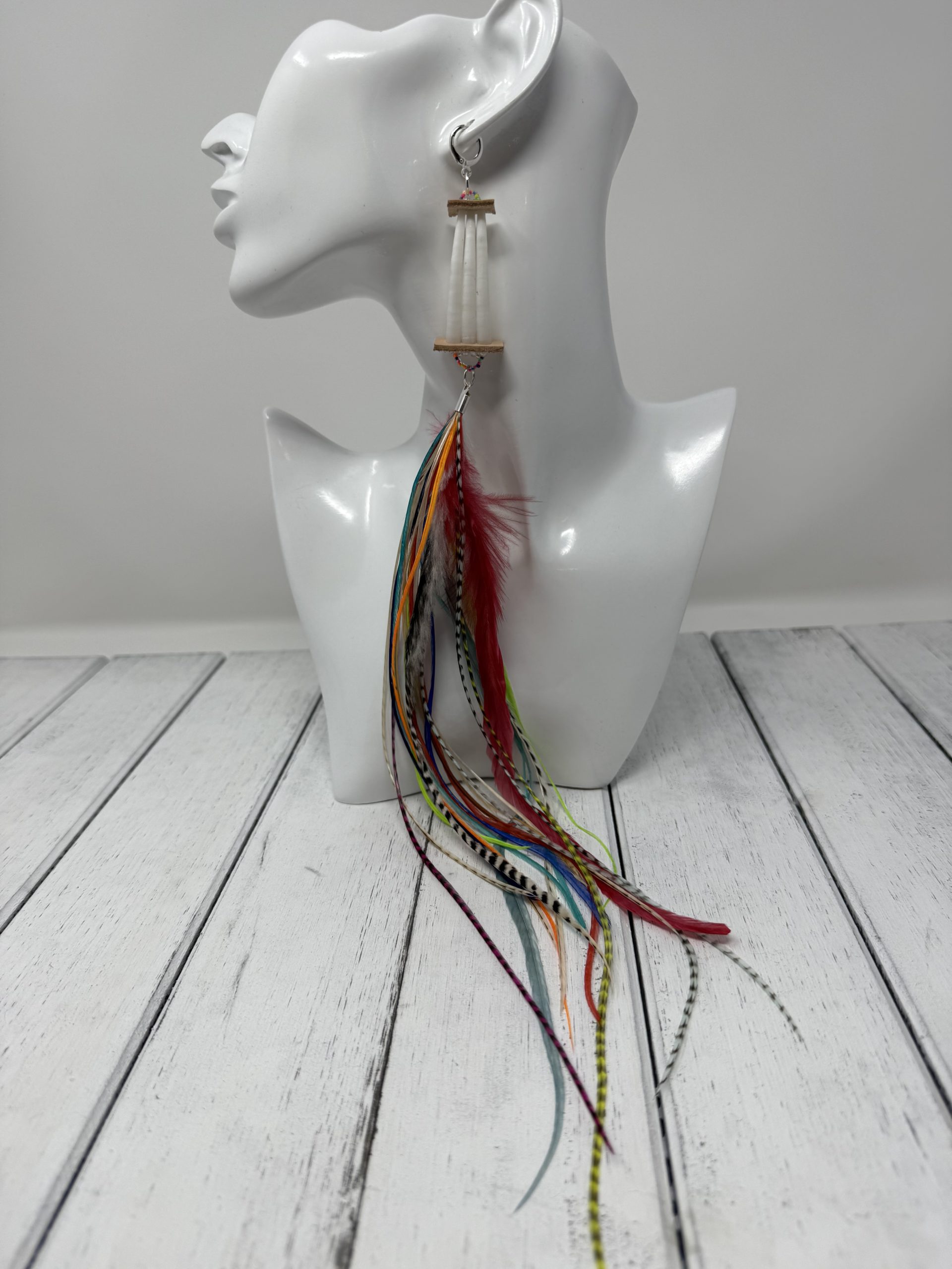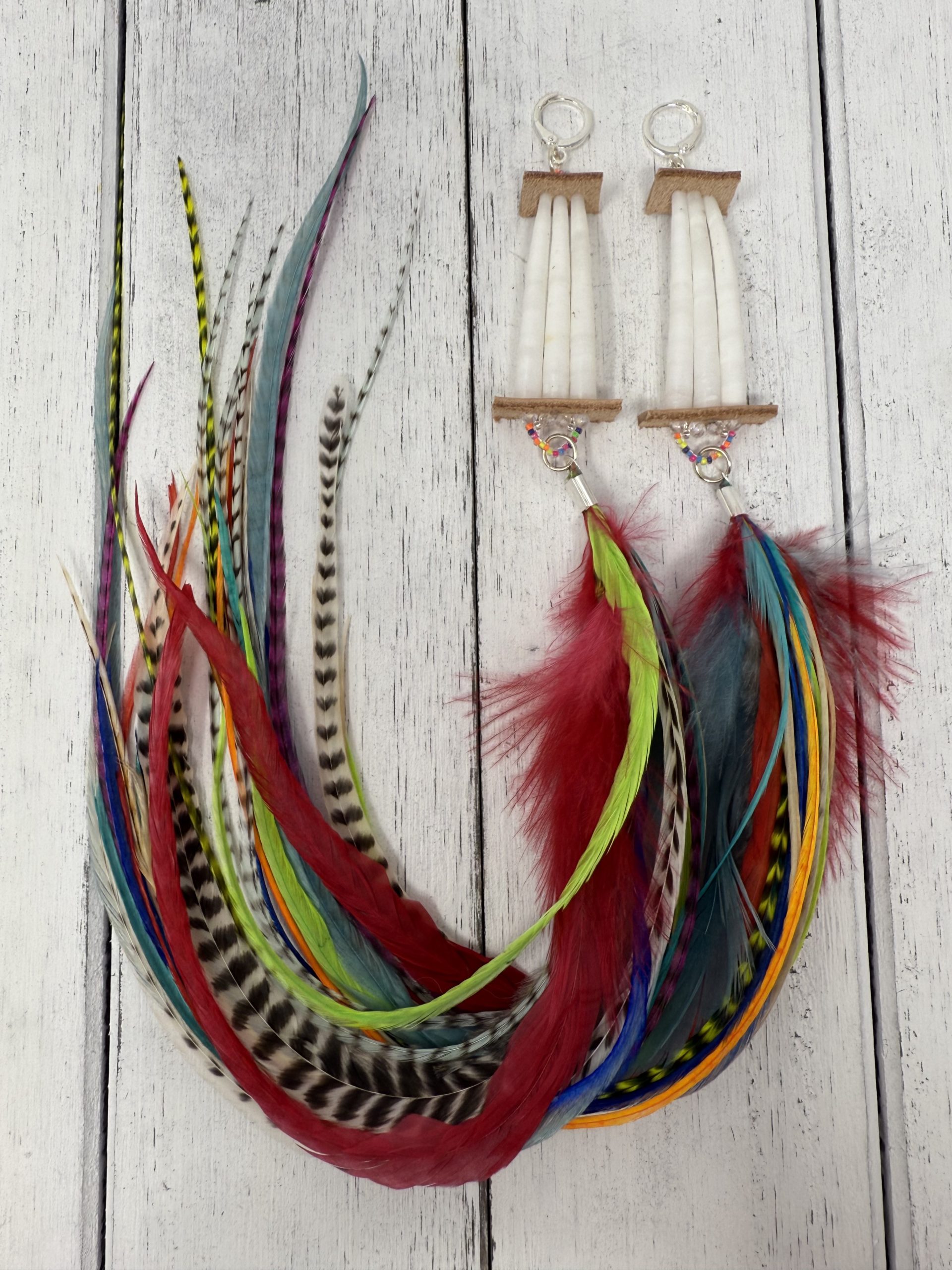 3 Tier Dentalium set is very lightweight. Hand dyed rooster feathers, premium grade. Sterling Silver latch hooks. 15 different colors for the feathers.