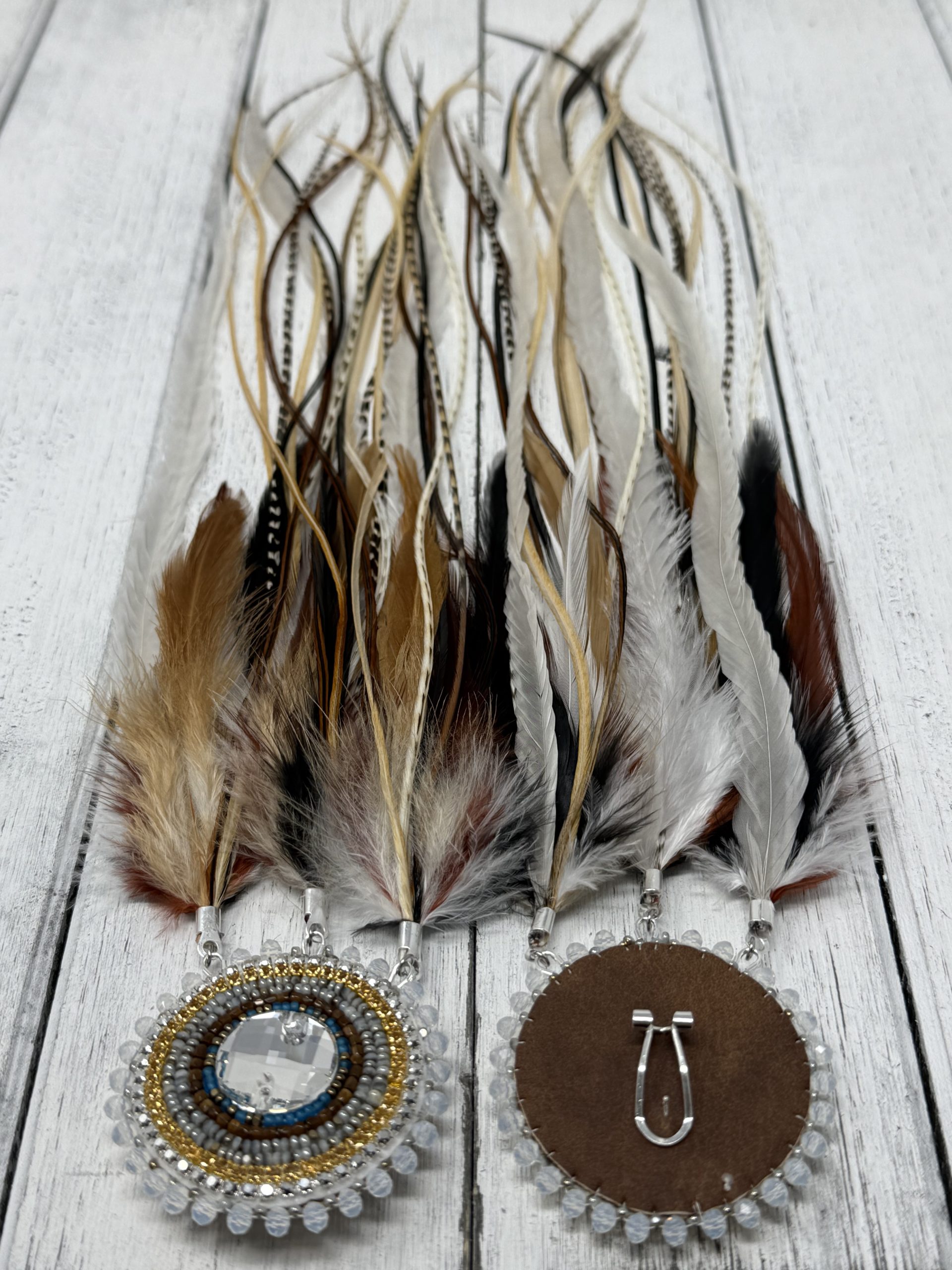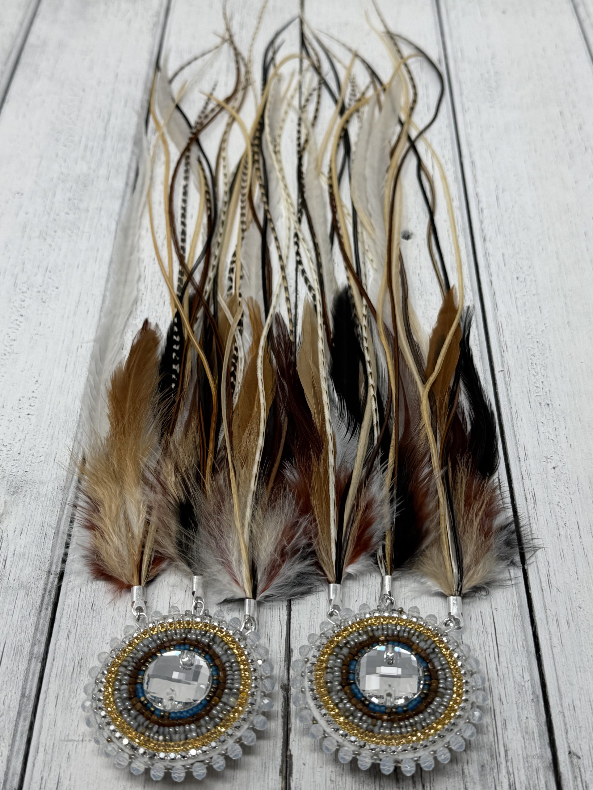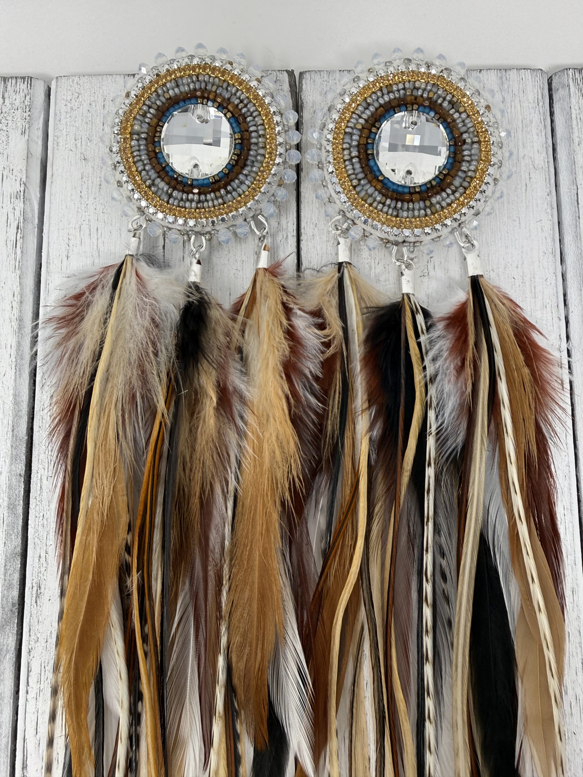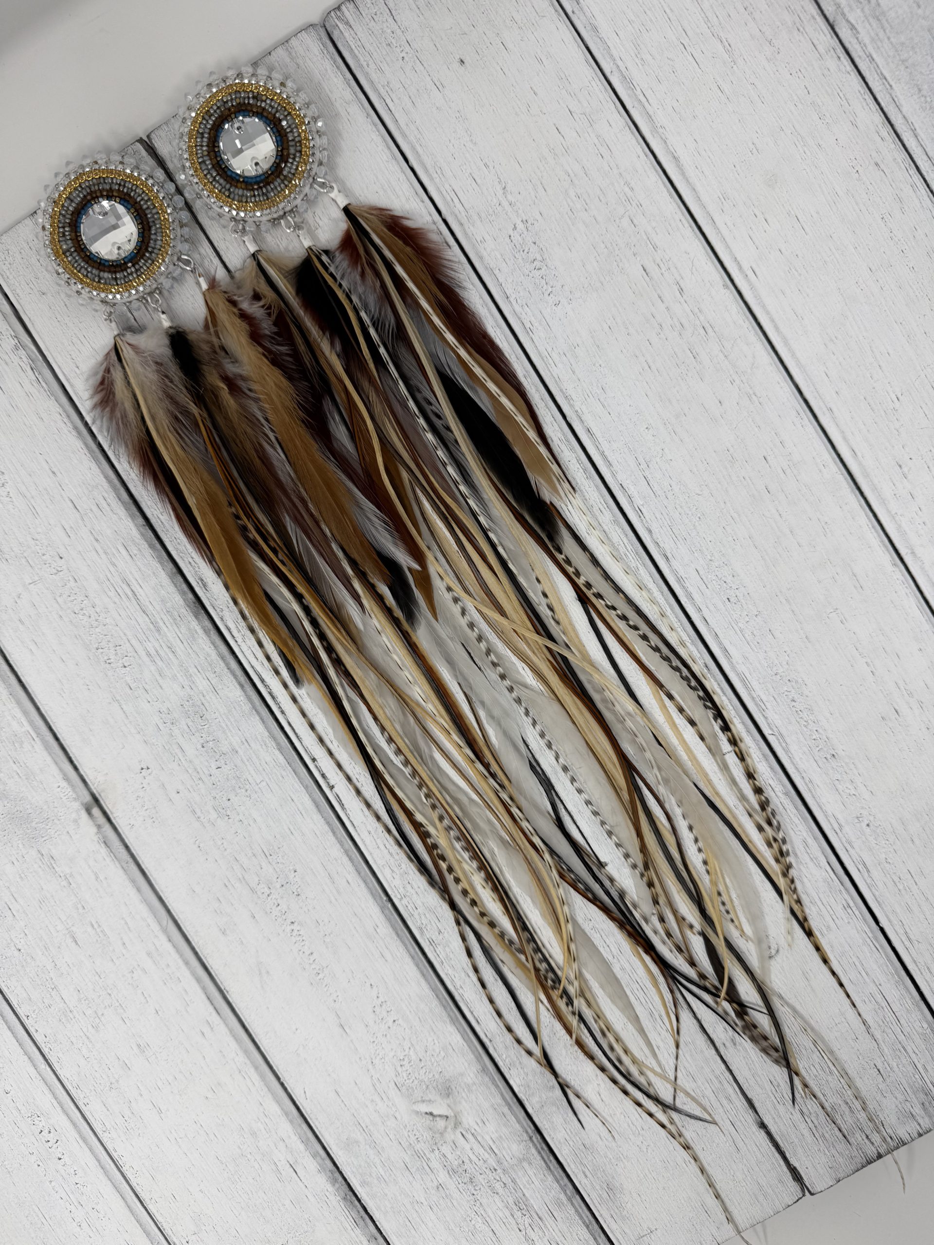 This Elegant set is handcrafted with Charlotte Cut SHEEN Beads. Edged with beautiful Opal Rondelles. Stitched around a K9 Crystal.  And all Natural Premium Grade Rooster Feathers.